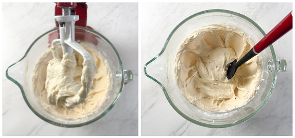 - Coloque na batedeira com o acessório raquete na velocidade lenta e vá adicionando a água morna aos pouco até formar uma mistura homogênea. Aumente a velocidade para média e continue a bater por cerca de 4-5 minutos até ficar com a consistência de uma massa de bolo espessa (a massa não cai facilmente do acessório raquete)